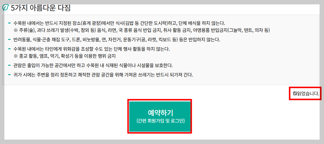 3. 지켜야 할 아름다운 다짐에 체크해 주시고 예약하기 버튼을 눌러주세요.