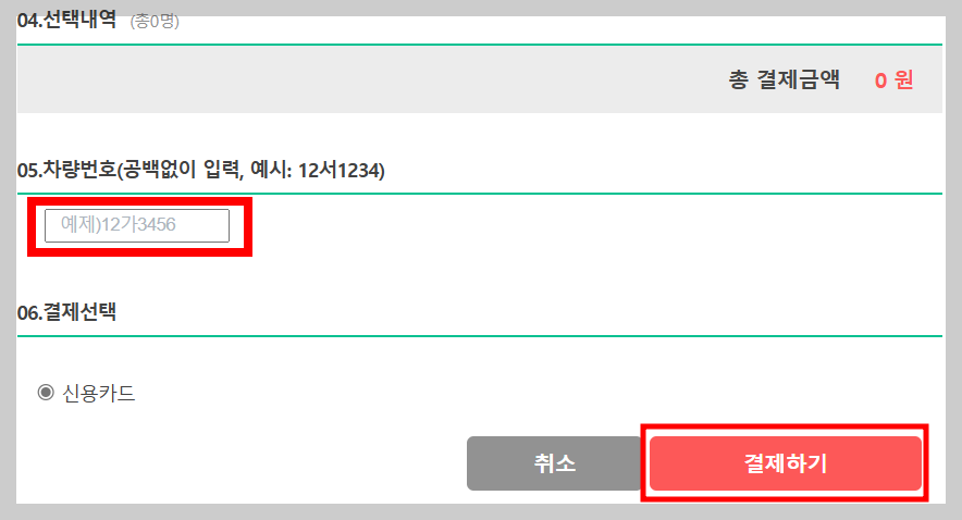 6. 차량번호를 입력해 주시고 결제를 해주시면 완료입니다.