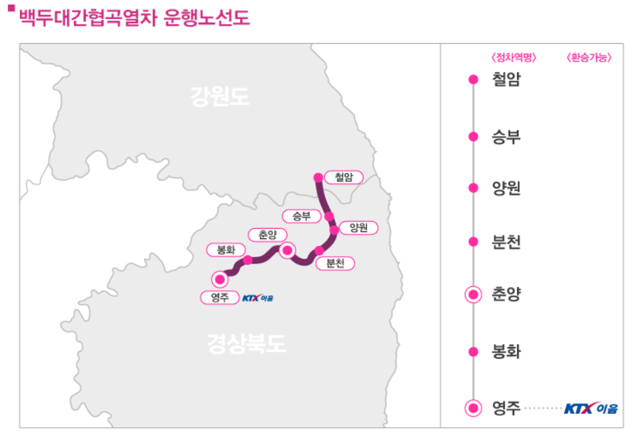 - 백두대간 협곡열차는 영주역에서 철암역까지 운행합니다.