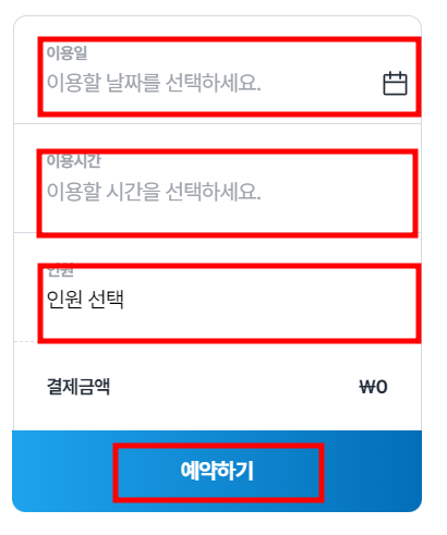 예약하기 버튼을 눌러서 이용하고자 하는 날짜,시간, 인원을 선택해 주시면 됩니다.