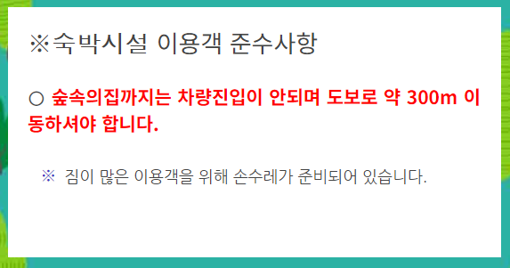 숲속의 집까지 차량을 가져갈 수 없습니다. 손수레를 이용할 수 있으니 짐이 많으신 분들은 손수레를 이용하시기 바랍니다.