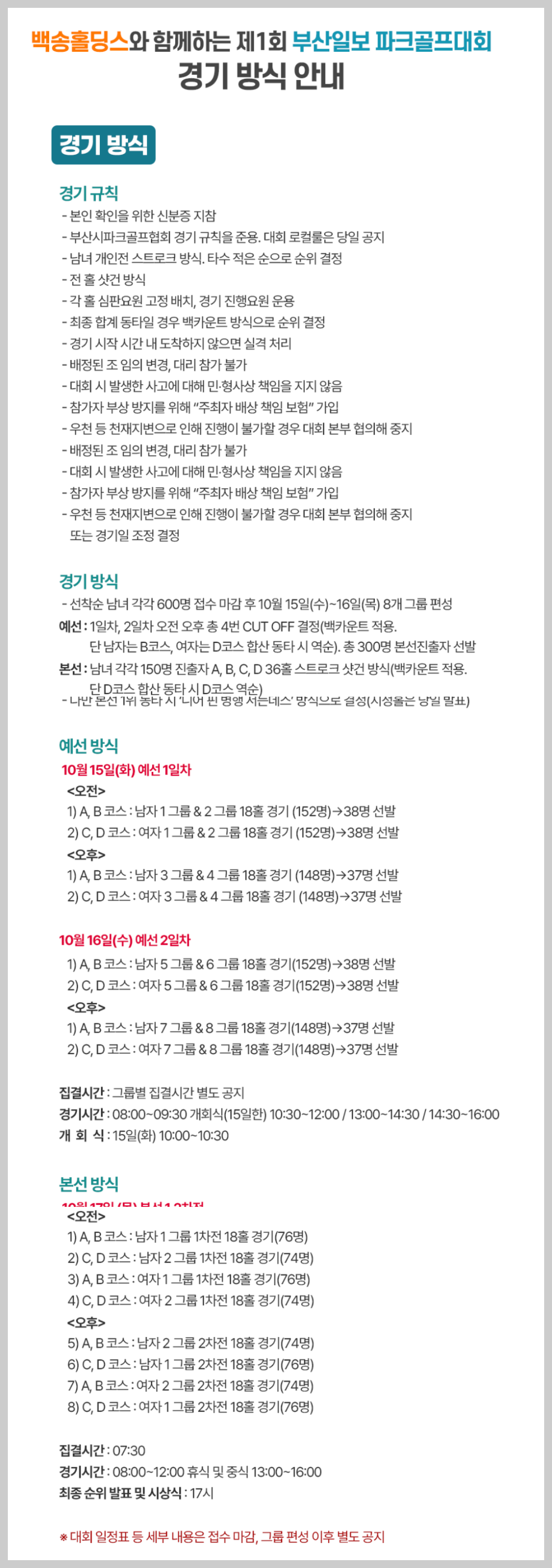 - 회원가입: 대회 홈페이지(parkgolf.busan.com)에서 미리 회원가입을 진행하세요.
