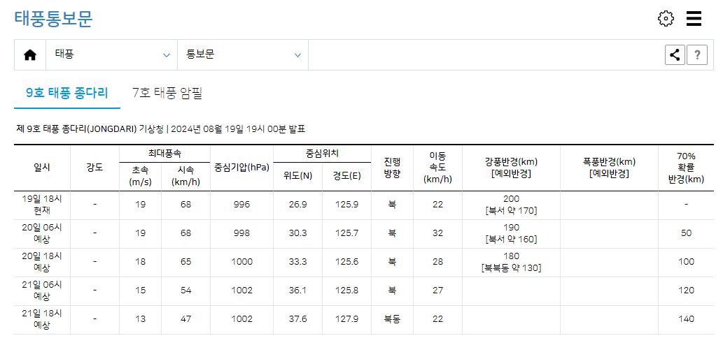 9호 태풍 종다리에 대한 정보는 8월 20일 22시경에 다시 발표할 예정이니 계속해서 태풍의 위치와 진로에 관심을 가져주시고 대비해 주시기 바랍니다.